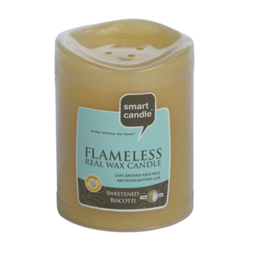 Smart Candle uses intelligent electronics and LEDs to generate a long-lasting, natural flickering light that perfectly simulates a wax candle flame. Smart Candle TruFlame is one of the most realistic flame colors available and provides warm ambient light without dangerous flames and hot wax. This 3 by 4 pillar, in a Beeswax finish, comes in a Sweetened Biscotti scent along with a 2-way switch. One switch has an on/off feature and the other switch has a 3-way timer: 4, 6 or 8 hours. This flameless pillar, that is safe around kids and pets, has an 800 hour battery life with 4 AA batteries (not included).